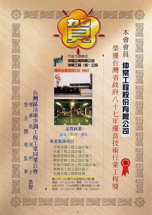 八十七年從台灣區數百家冷凍空調工程公司中脫穎而出,榮獲台灣省優良技術行業工程表揚及肯定。